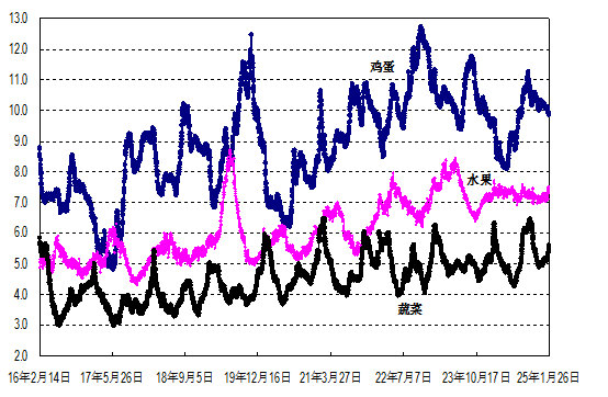 據(jù)農(nóng)業(yè)農(nóng)村部監(jiān)測,2025年第4周(2025年1月20—26日,下同)“農(nóng)產(chǎn)品批發(fā)價格200指數(shù)”為125.30(以2015年為100),比前一周升2.77個點,同比低0.56個點;“‘菜籃子’產(chǎn)品批發(fā)價格指數(shù)”為127.26(以2015年為100),比前一周升3.20個點,同比高0.28個點。