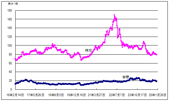 國際棉花價格指數(shù)(SM級)每磅78.76美分(每噸1736美元),環(huán)比基本持平,同比低18%。