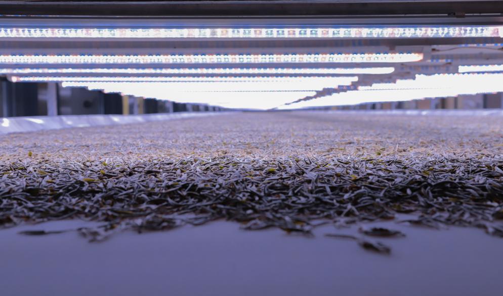在品品香LED光源萎凋車間,黃、藍、白光經過一定比例的調配、計算后,形成標準參數,模擬“陽光明媚,通風透涼,濕度低的北風天”。萎凋生產線兩邊的送風口,根據萎凋時間和進度,自動調節風速和風力大小。